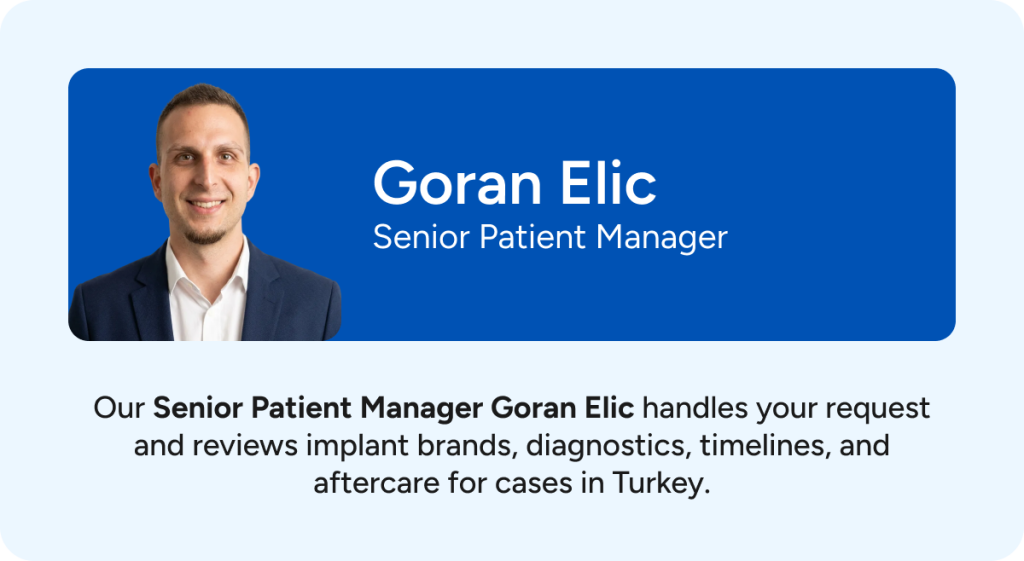 Your review is handled by Senior Patient Manager Goran Elic and our patient coordination team, who work daily with implant cases in Turkey and are trained to identify risk before treatment begins.